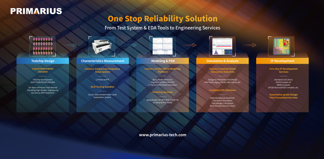 Primarius' reliability solution is designed to tackle reliability challenges in new material research, advanced process technology R&D, device characterization, and chip design. The solution covers reliability test chip design, reliability data measurement, reliability modeling and PDK development, simulation and analysis for reliability, high-sigma yield, and noise characteristics, as well as comprehensive ESD protection design verification,and automotive IP development services.