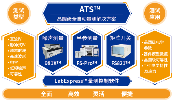 可根据使用需求灵活的集成多种软硬件,测量涵盖电流电压(IV)、电容电压(CV)、脉冲式IV、高速时域信号采集、低频噪声测试以及多种可靠性测试。